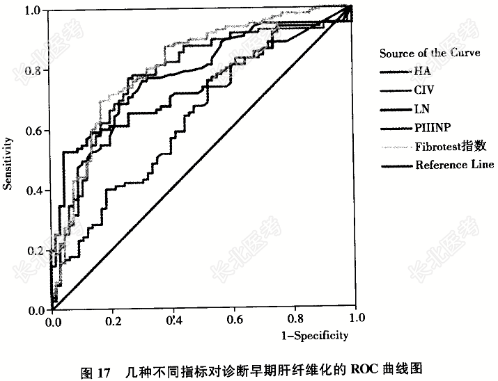 图17是几种不同指标对诊断早期肝纤维化的ROC曲线图。各指标曲线下面积分别为:HA0.626,CIV0.771,LN0.738,PⅢNP0.755,FibrOtest指数0.80。